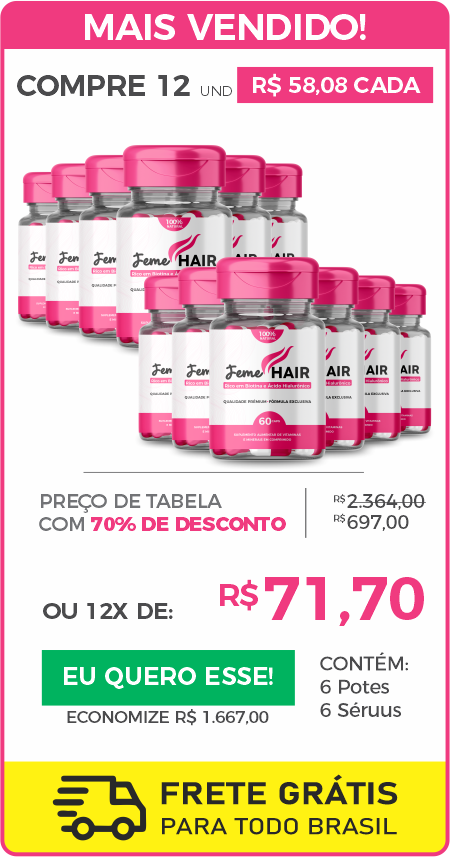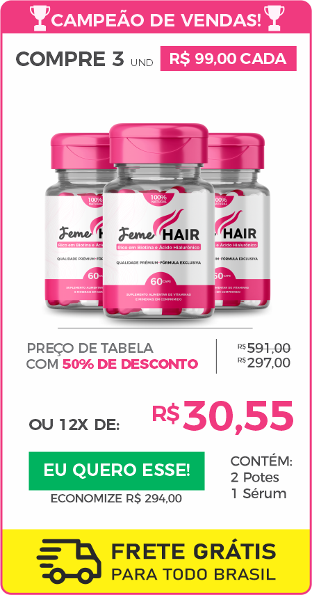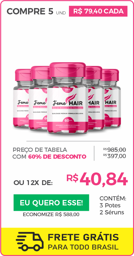 Este site é 100% protegido contra recursos de má intenção. Suas informações pessoais são sigilosas segundo a nossa Política de Privacidade e a entrega é garantida! O FEME HAIR é vendido diariamente para pessoas de todo o Brasil.